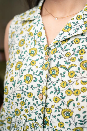 Refresh your wardrobe with this Floral Print Sleeveless Women Peplum Top, designed to bring effortless charm and feminine flair to your everyday style. Featuring a delicate green and yellow floral print on a soft base, this top adds a fresh and vibrant touch to your look.