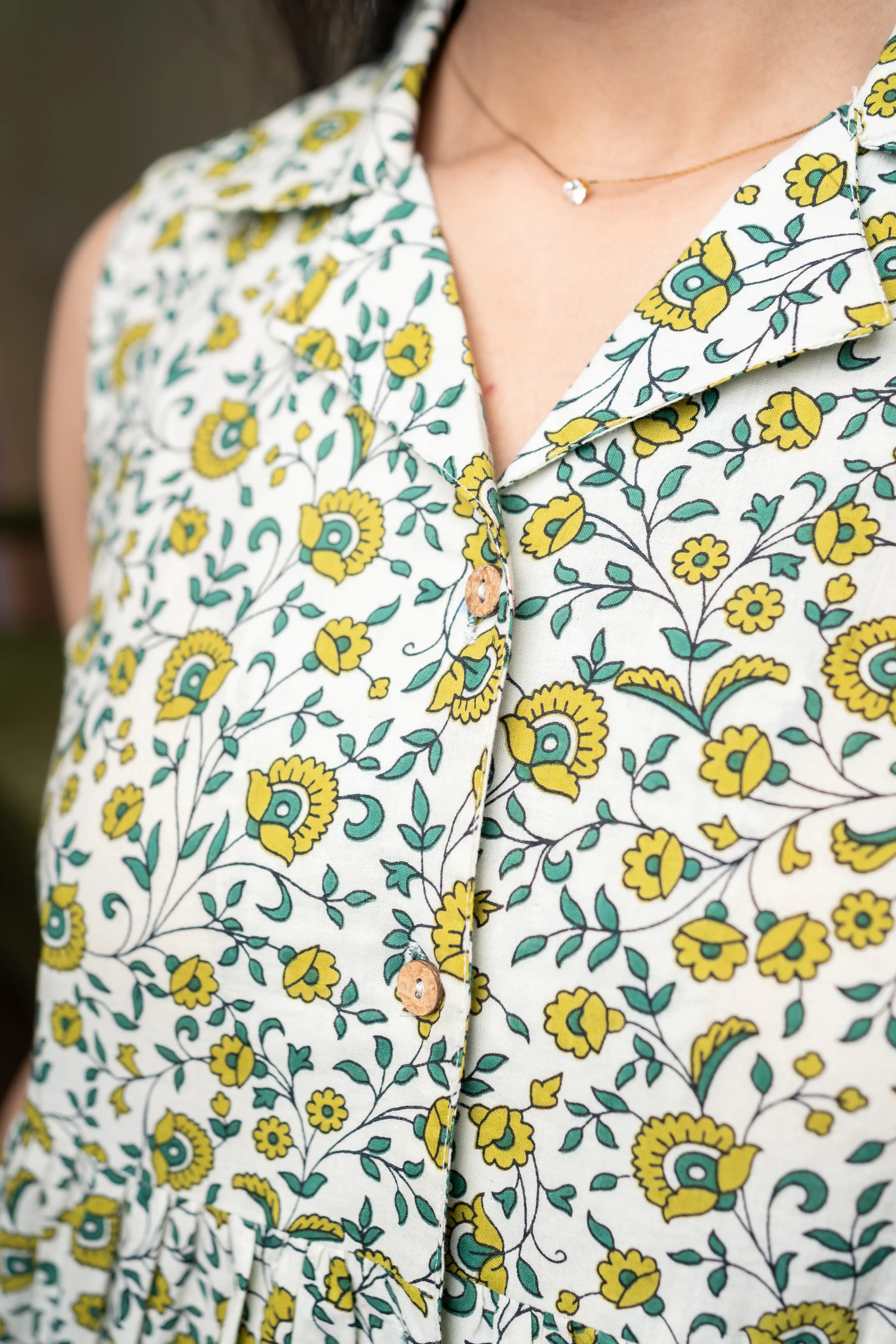 The sleeveless design keeps it light and breathable, making it perfect for warm days and easy layering. The flattering peplum silhouette cinches gently at the waist and flows gracefully, enhancing your natural shape while ensuring all-day comfort. Subtle front button detailing adds a refined finish to the overall design.