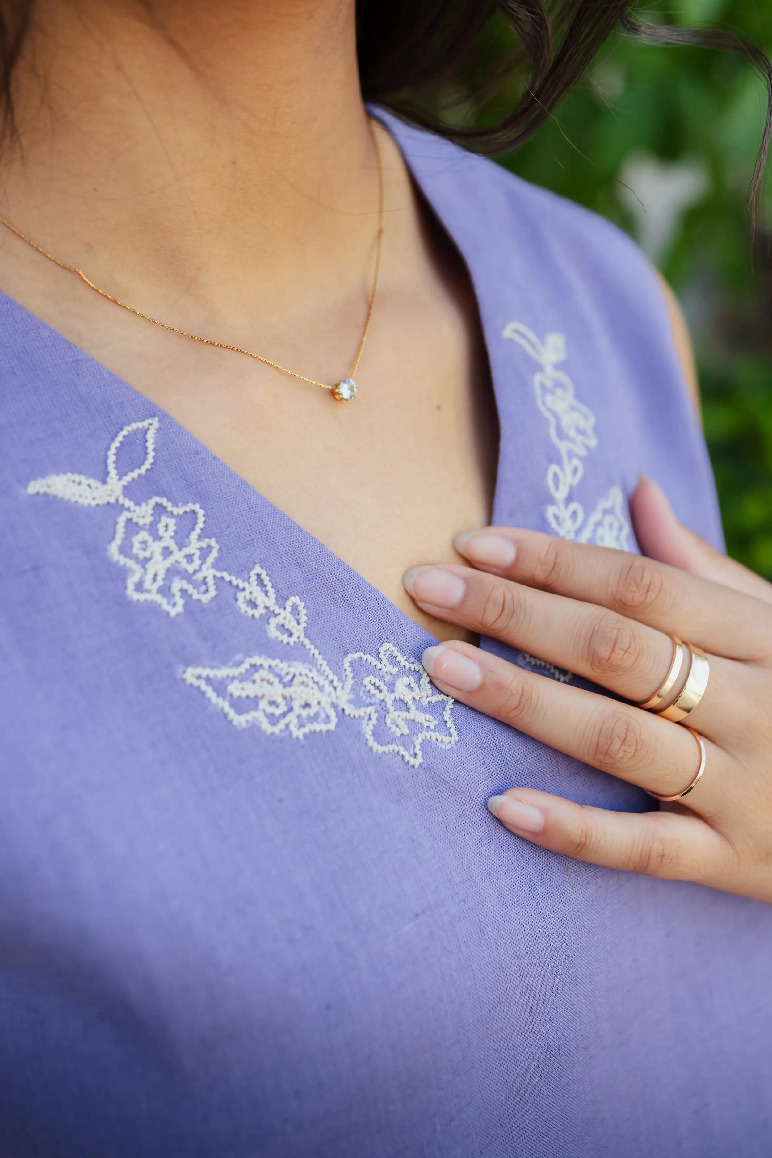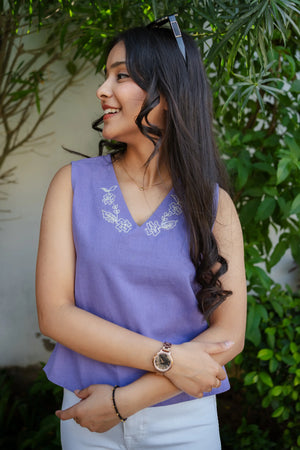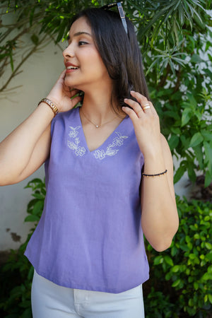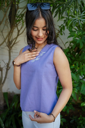 The soothing lavender shade creates a fresh and feminine look, while the subtle floral embroidery along the V-neckline adds refined sophistication. Its sleeveless design makes it perfect for warm weather, layering, or creating light and breezy outfits. The relaxed silhouette ensures all-day comfort while maintaining a flattering fit.