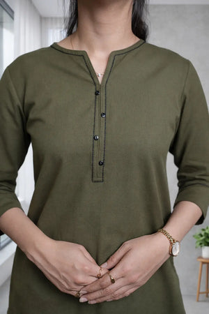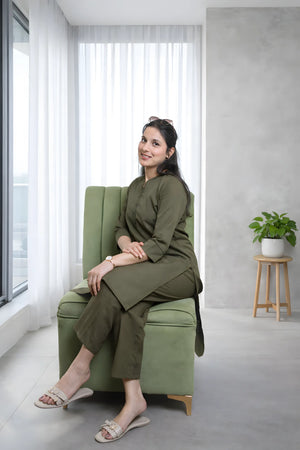The olive green kurta features a clean silhouette with a subtle buttoned neckline, offering a refined and polished look. Its straight cut ensures a flattering fit, while the breathable fabric provides ease of movement throughout the day. Paired with matching straight pants, this set creates a balanced and effortlessly stylish ensemble.