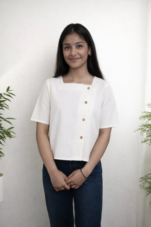 The soft off-white shade gives it a fresh and timeless appeal, making it ideal for summer days and effortless layering. The front wooden button detailing adds a natural, refined touch, while the relaxed fit ensures ease of movement and all-day comfort.